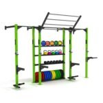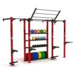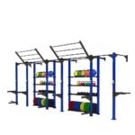 This wall mounted standing rig is a modular steel training system designed for functional strength work and organized equipment storage. The visible configuration combines wall-supported uprights, overhead monkey bar sections, pull-up positions, rack-style posts, storage shelves, and lower plate storage within one connected frame. It suits commercial gyms, performance facilities, school training rooms, and boutique studios that want a structured training zone without relying on multiple separate storage and rack units. The integrated layout helps centralize accessories and free weights around the rig, making it practical for facilities that want cleaner floor organization and more efficient use of shared training space.